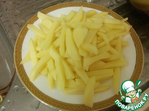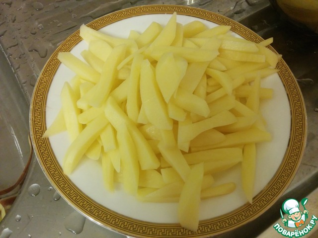 Пока варится горох, берем картошку, очищаем от кожуры, нарезаем соломкой, за 15 минут до готовности подливы жарим.