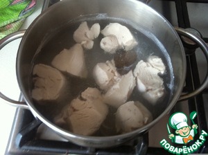 Отвариваем в небольшом количестве воды (1-1,5 л) филе курицы. Количество воды желательно сопоставить с количеством овощей. Чтобы, когда вы их забросите в кастрюлю, готовый бульон их прикрывал, но при этом овощи не плавали в море - океане.