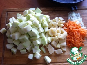 Пока филе варится (а оно будет готово очень быстро), трем морковь, нарезаем лук и кубиками картофель и кабачок.