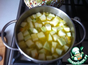 Пассеруем лук и морковь на сковороде и добавляем к нашему бульону с куриным филе. Туда же засыпаем кабачок и картофель. Слегка солим, помня о том, что щавель придаст кислинку супу, добавляем перец, хмели-сунели и другие любимые вами приправы.