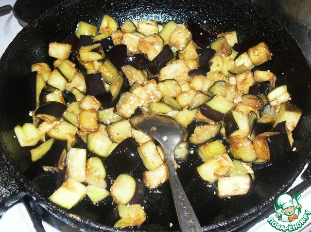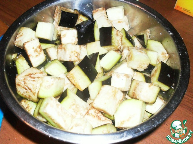 Баклажаны нарезаем кубиком 2*2, солим и отставляем на 20 минут, чтоб пустили сок.