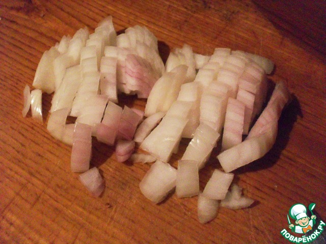 Пока баклики обжариваются, чистим и режем мелким кубиком лук.