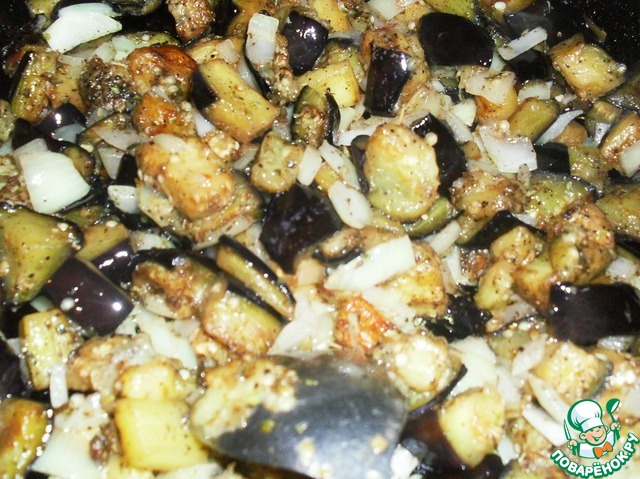Добавляем лук к бакликам и обжариваем все вместе. На этом этапе добавляем перец, майоран, тимьян и по необходимости-соль.