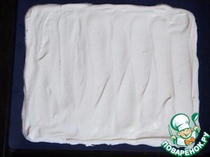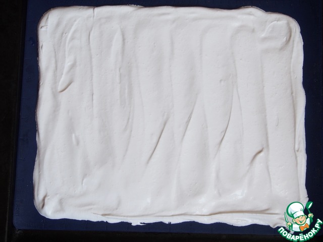 Противень застелить бумагой для выпечки, смазав ее тонким слоем масла (я выпекала на силиконовом коврике, ничем его не смазывая). Разровнять ложкой белковую массу толщиной 1,5 см, выпекать 45 минут в духовке, заранее разогретой до 140 градусов.