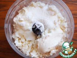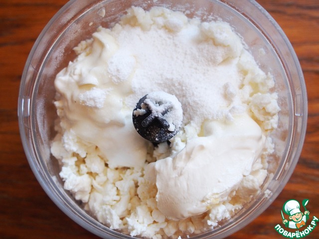 В блендер поместить творог, сметану и сахарную пудру. Взбить.