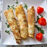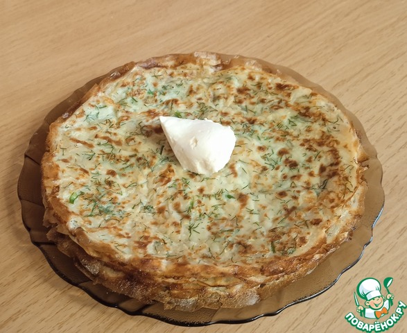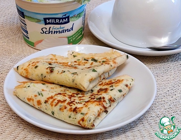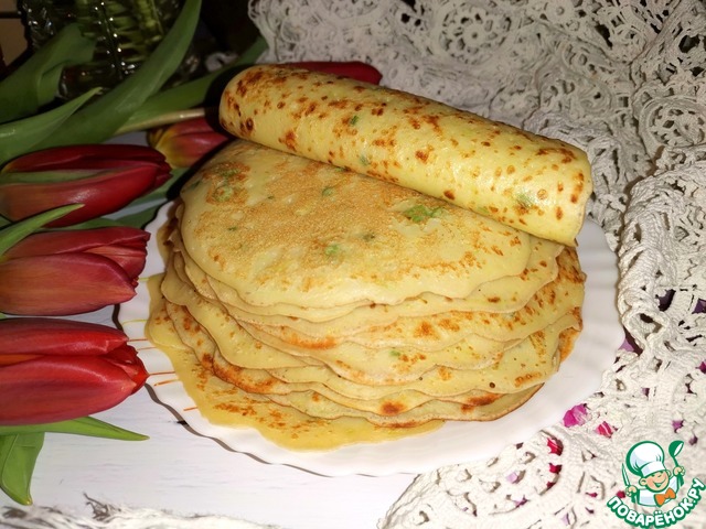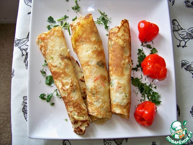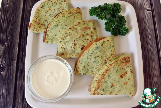 Блинчики жарим на сковороде с двух сторон, как обычные блины. Подавать можно со сметаной или растопленным сливочным маслом, либо чесночным соусом. Также можно нафаршировать чем угодно.