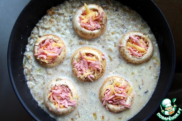 Натереть на терке ветчину и сыр, начинить шляпки грибов. Выложить их в сковороду к гречке и тушить на маленьком огне пока вся вода не впитается.