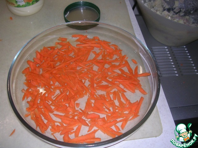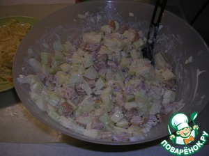 Кабачок, курицу и лук перемешать с 2-мя столовыми ложками майонеза.