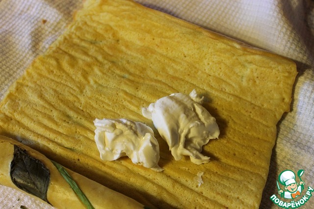 • Остывший рулет развернуть, смазать обильно плавленым сыром.