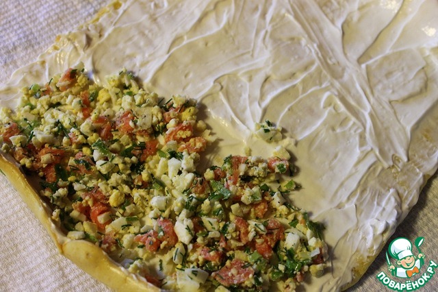 • Сверху выложить начинку, разровнять ее и свернуть рулет по короткой стороне.