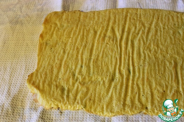 • Осторожно снять бумагу и свернуть по короткой стороне вместе с полотенцем. Остудить.