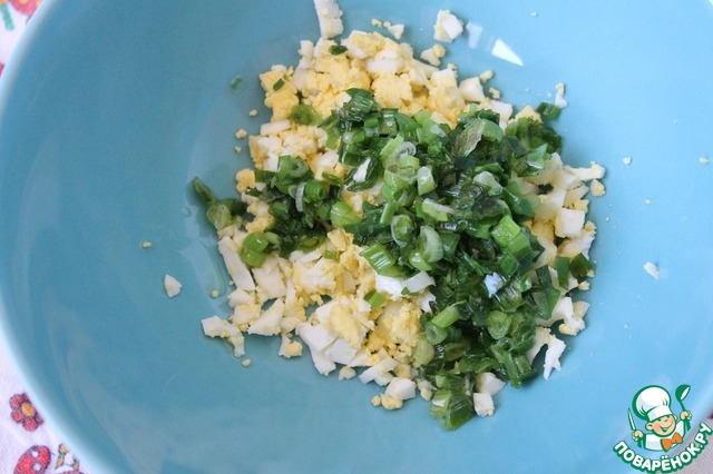 • Яйца мелко порубить, добавить к ним обжаренный лук, посолить и поперчить.