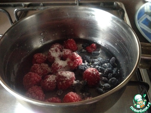 В воду добавить ягоды (у меня малина и жимолость, можно любые) и оставшийся сахар, проварить 5 минут.