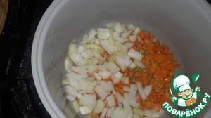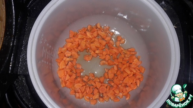 Овощи вымыть и почистить. Мультиварку включить на режим "жарка" на 15 минут. Влить в кастрюлю растительное масло и закрыть крышкой пока не нагреется. Морковь порезать кубиками и обжаривать в масле 3-4 минуты.