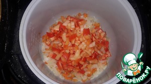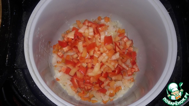 Перец очистить от семечек, порезать кубиками и отправить в кастрюлю. Обжариваем еще 4 мин.