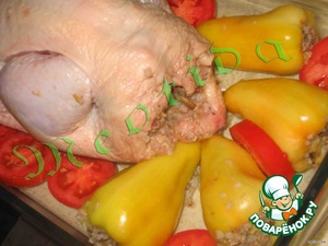 И курочку, и перчик фаршируем гречнево-грибной начиночкой, выкладываем их в форму для запекания: в центр - курочку, по бокам помидорчики и перчик. -