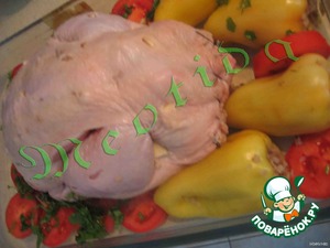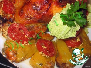 Обмазываем соусом курочку со всех сторон и овощи, на слой помидоров выкладываем капусточку, тоже обмазанную соусом.