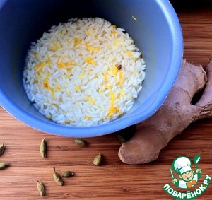 С апельсина снять цедру и выжать сок, вынуть зернышки кардамона. Добавить сок, цедру и кардамон в рис, залить водой и поставить на огонь.