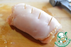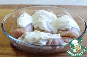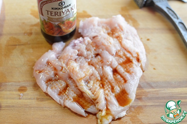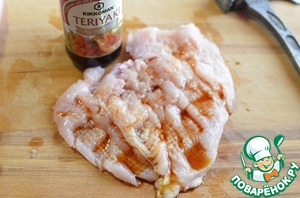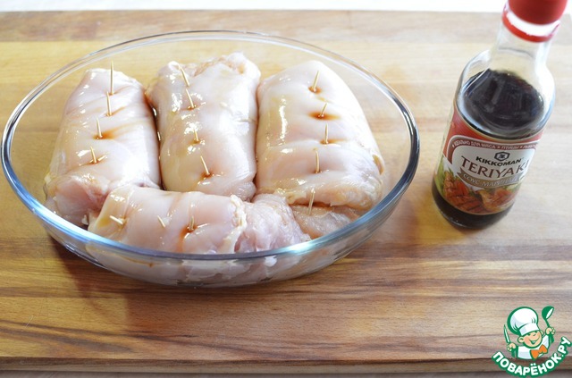 Каждую грудку полить соевым соусом. На мой вкус, соли тут не нужно.