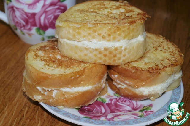 Взять два ломтика, намазать один примерно 1/4 творожного сырка и накрыть вторым ломтиком...