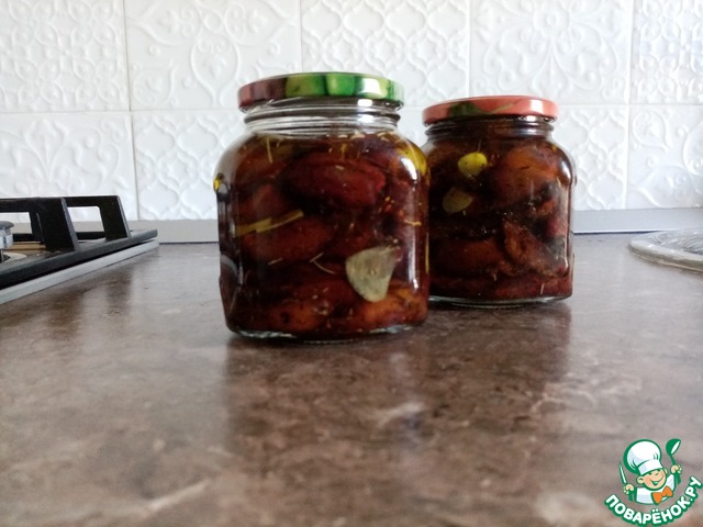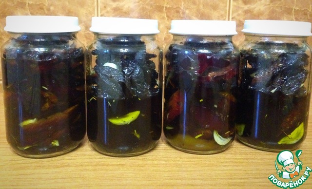 Приготовила сливы. Была Уральская слива, дичка - терн. Делала все по рецепту. Маслом залила, закатала. Делала по пропорциям, согласно весу своей сливы, получилось 3 баночки 100 мл.