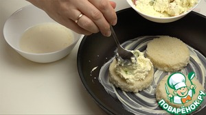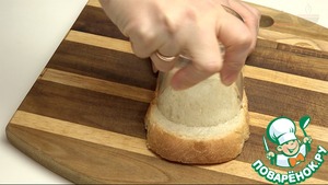 Кусочки хлеба обмокнуть одной стороной в молочную смесь и уложить в форму, смазанную сливочным маслом, влажной стороной вниз. Выложить начинку. Накрыть кусочками хлеба - влажной стороной наверх.