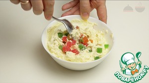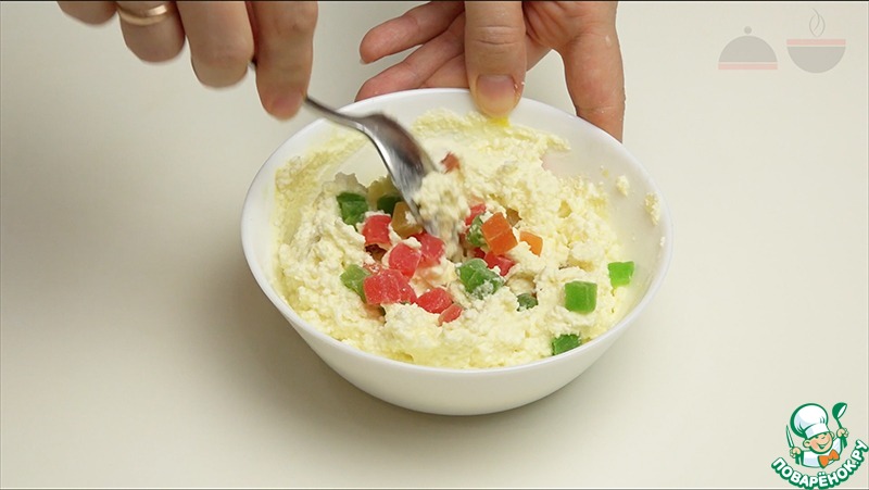 Приготовить начинку. Для этого в творог добавить желток, 2 столовых ложки сахара, щепотку соли и цукаты. Перемешать.