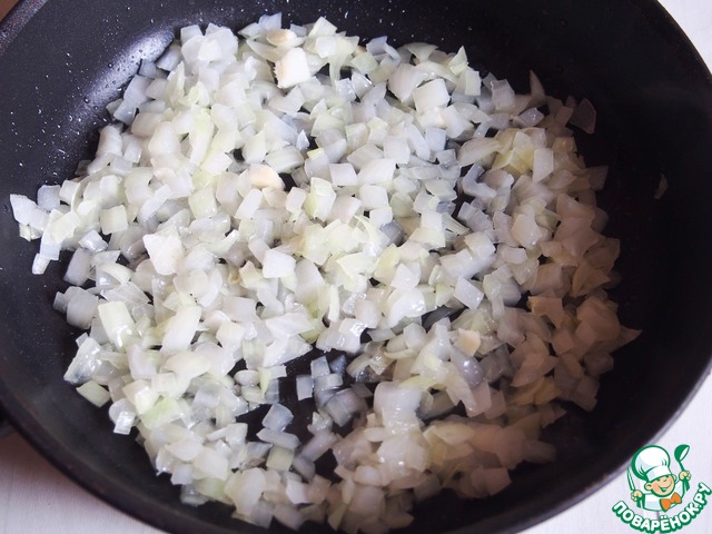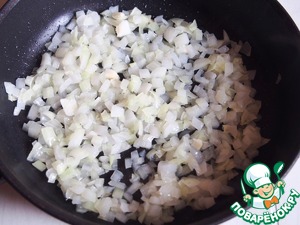 Лук почистить, мелко порезать и обжарить в оливковом масле до прозрачности.