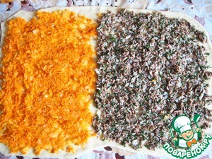 На одной половине теста распределить рыбную начинку, а на другой - овощную.