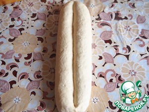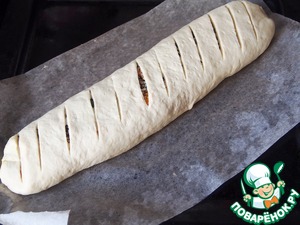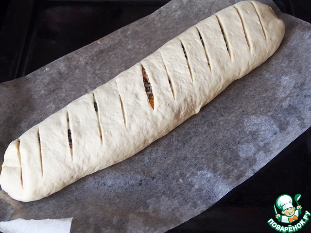 Рулет переложить на противень, застеленный бумагой для выпечки и смазанной растительным маслом, ровной поверхностью вверх. Сделать надрезы и выпекать в духовке, заранее разогретой до 180 градусов, 25-30 минут, до румяности.