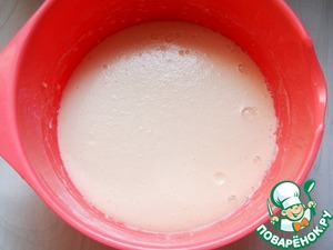 В тёплом молоке развести дрожжи, добавить сахар, просеянную муку (100 г). Оставить в тёплом месте на 15 минут.