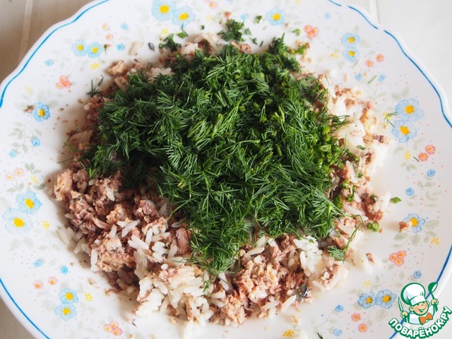 Укроп промыть, мелко порезать и добавить к сайре с рисом.