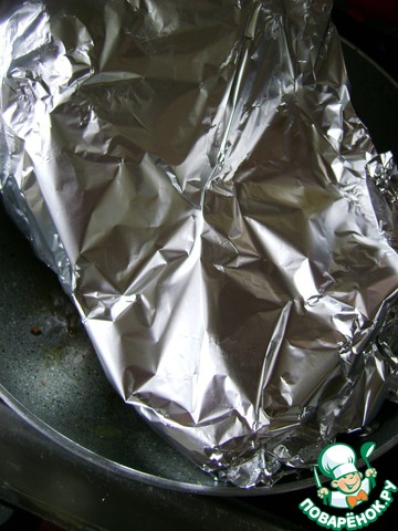 Готовое мясо завернуть в фольгу блестящей стороной к мясу и дать выстояться не менее 20 минут для распределения соков. Так мясо останется сочным при нарезке.