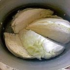 Половинки капусты помещаем в кастрюлю, заливаем холодной водой, чтобы только покрыла продукт. Варим 6 минут. За 2 минуты до окончания варки добавляем соль. Если край кочерыжки пртыкается вилкой, значит половинки готовы.