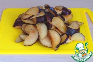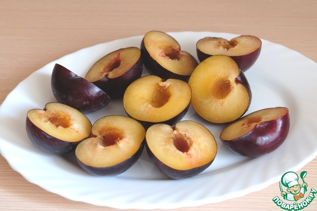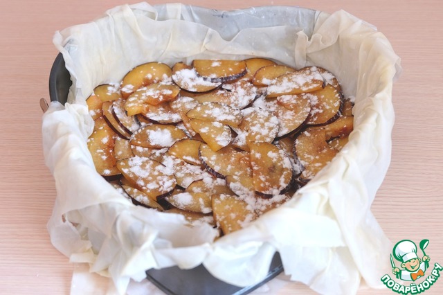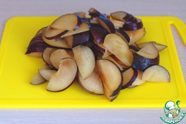 Форму для выпекания выстлать пекарской бумагой, промазанные сливочным маслом листы теста фило выложить в форму для выпекания один на другой. Всего 5-6 листов. Края теста должны свешиваться через бортик формы. На листы теста выложить пластинки сливы. Сливу подпылить крахмалом, посыпать коричневым сахаром. Края теста подвернуть к центру.