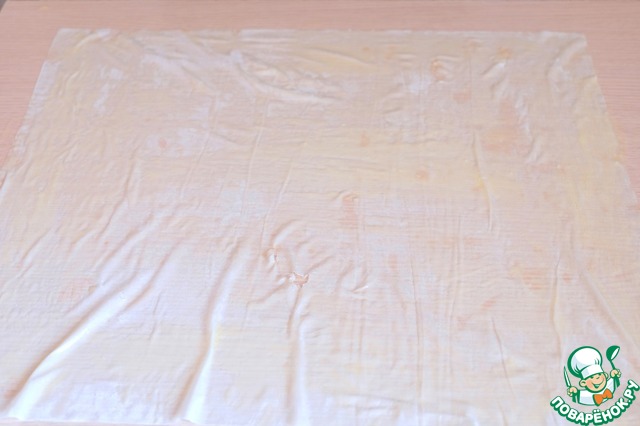 Листы теста разморозить. Сливочное масло растопить. Лист теста смазать растопленным сливочным маслом.