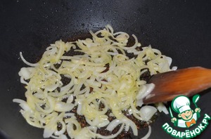 Обжарить на нем лук до прозрачности, добавив щепотку сахара.