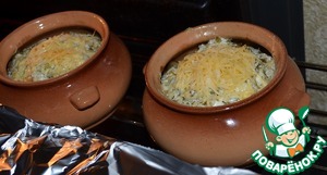 Открыть горшочки, добавить по 1 ст. л. тертого сыра. Увеличить температуру в духовке до 200 градусов и запечь сырную шапочку до красивого румянца, 5 - 7 минут.