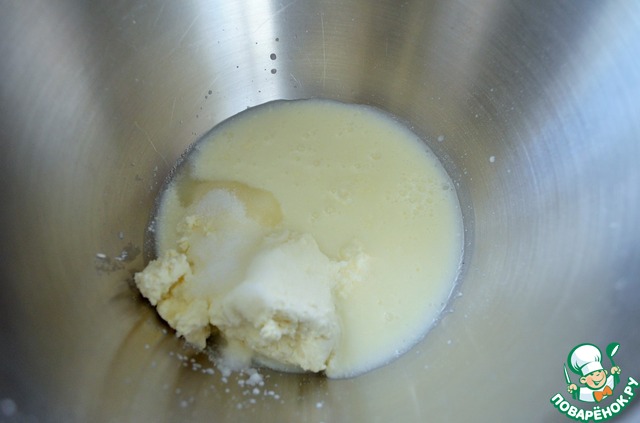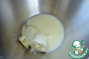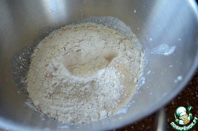 Всыпать сухую смесь к молочной. Перемешать на средней скорости комбайна, до полного соединения. -