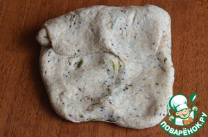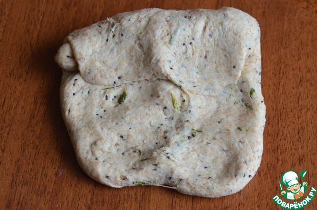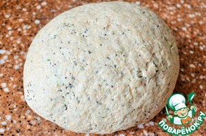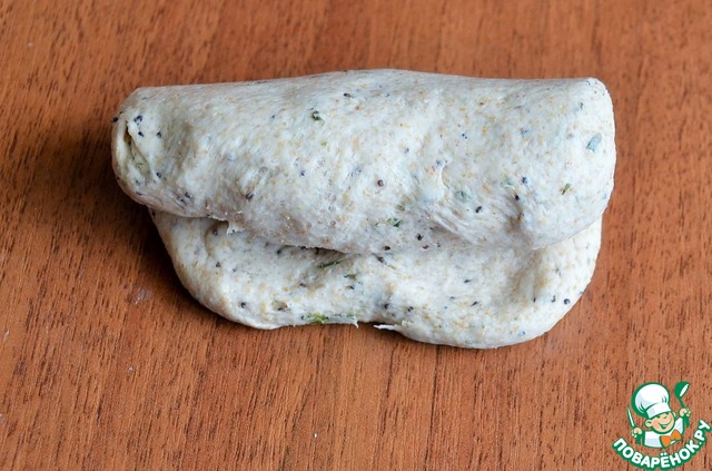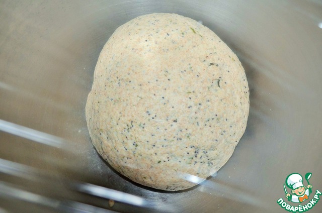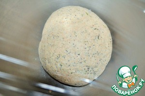 В дежу всыпать мак и петрушку, вернуть тесто и продолжить замес, 5 минут.