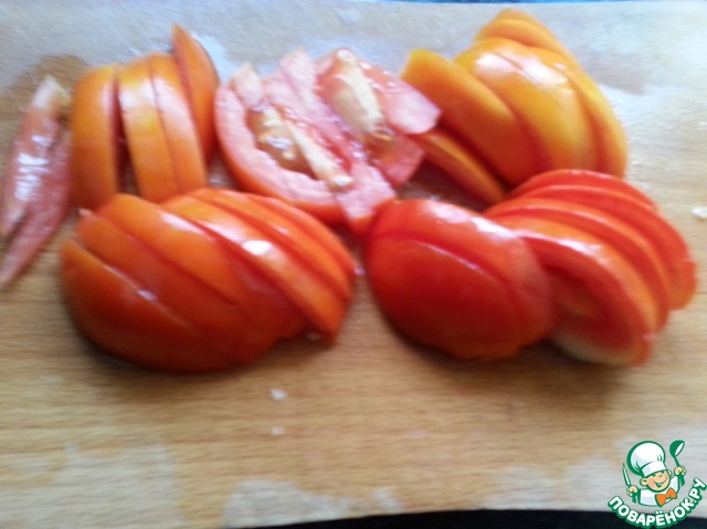 Помидоры (в оригинале перец болгарский) нарезать дольками.