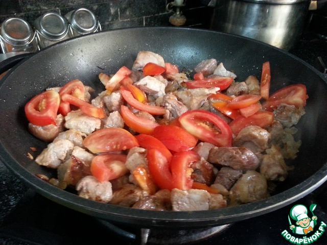 К мясу добавить лук, когда он подрумянится, добавить помидоры (перец) и потушить до готовности перца (помидоры быстрее готовятся).