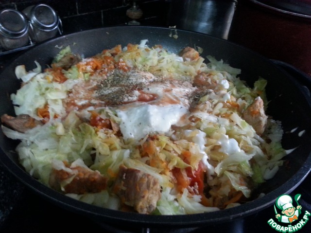 Добавить капусту, уменьшить огонь и под крышкой тушить 10-15 мин. Затем добавить томатный соус, сметану, сухие травы, соль, перец. Хорошо перемешать и потушить еще 10-15 мин.