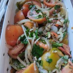 Помидоры помыть и нарезать тонкими дольками, вырезая плодоножки