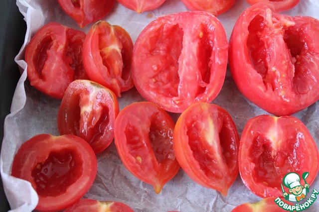Помидоры разрезать пополам и ложкой удалить семена, оставляя перегородки.