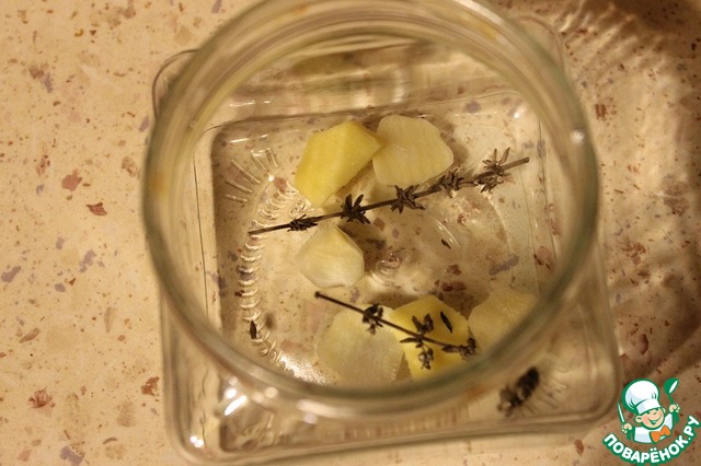 На дно банки положить 2 веточки тимьяна, чеснок, нарезанный пластинками, и имбирь.