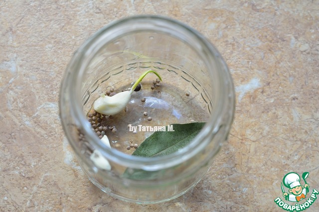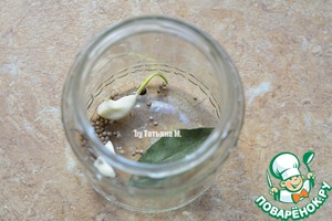 В чистые банки выложить кориандр, перец, чеснок и лавр;