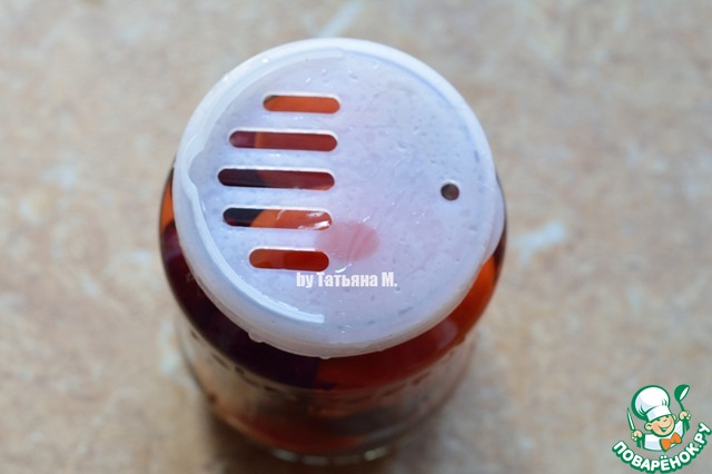 Довести маринад до кипения, залить банку, в банку добавить уксус и сразу укупорить стерилизованными крышками;