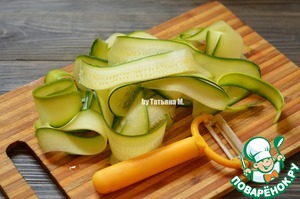 Вкусная закуска из тонких слайсов кабачка в качестве самостоятельной или для украшения различный блюд в зимний период! Кабачки можно кушать уже на следующий день или заготовить впрок - пряный маринованный вкус с ароматом соевого соуса!