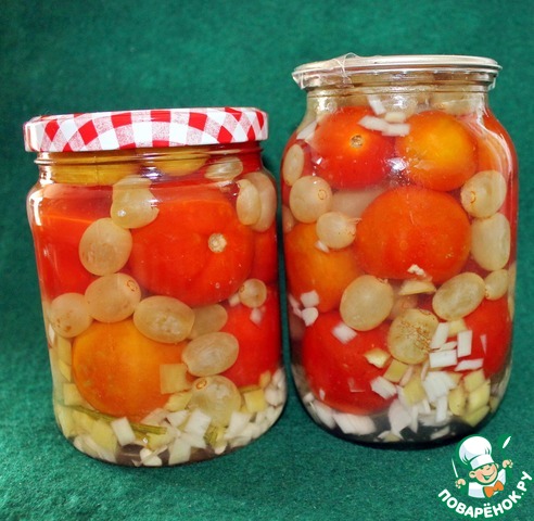 Я делала помидоры с виноградом по рецепту Тани Водолейки, мне очень понравилось. Но в этом рецепте другой набор специй, обязательно попробую и его. Особенно мне нравится, что заливка только 2-кратная, страшно не люблю этот муторный процесс с лёпаньем воды из банок в кастрюлю и обратно